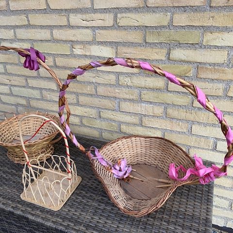 Fin flettet hængekurv med plastforing. Højde 30 cm og Diameter top 21 cm. Længde af metalophæng 33 cm. Krog 7 cm.