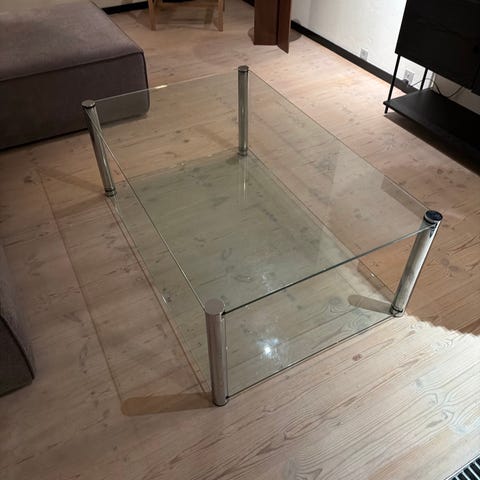 Flot glas sofabord med egetræs ben look sælges. Har justerbare føder. Ser helt nyt ud.