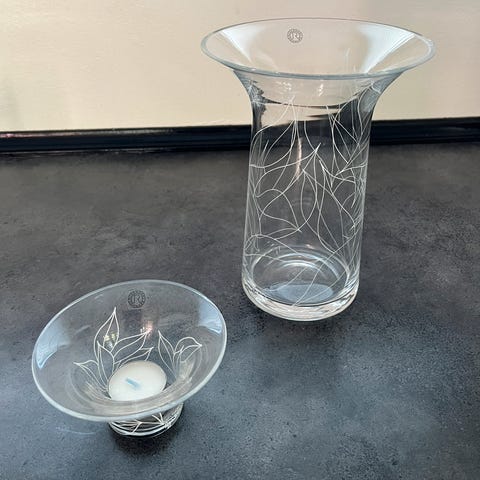 Der er et Micro hak i vasen (ses næsten ikke) har trukket fra i den samlede pris for sættet
