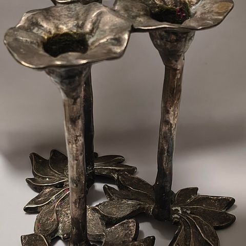 Vintage messing lysestage med pige der holder 2 lysestager til kertelys.