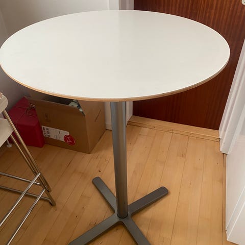 Fint, hvidt cafébord, fx til messer og udstillinger, eller til ekstra spiseplads i køkkenet. Træ/hvid laminat, mat overflade. Der medfølger to stole, som er 74 cm høje.