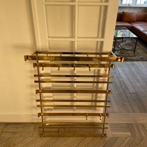 En virkelig eksklusiv og smuk gammel messing væg garderobe fra 1960'erne. Tophylden (eller hattehylden om man vil) er designet med runde messingstænger.
