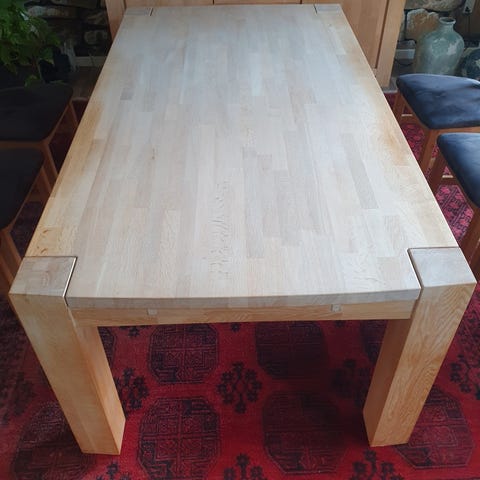 Velholdt bord, har altid haft klar voksdug på. Der medfølger 2 stk. tillægsplader som måler brede 100 cm, længde 50 cm og 3,8 cm tykt.