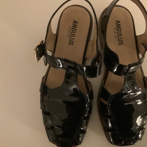 Sorte laksandaler fra Angulus str. 38, måler 25.2cm i længden. Brugt een gang, for min datter brød sig ikke om dem. De er så fine, uden mærker og slid.