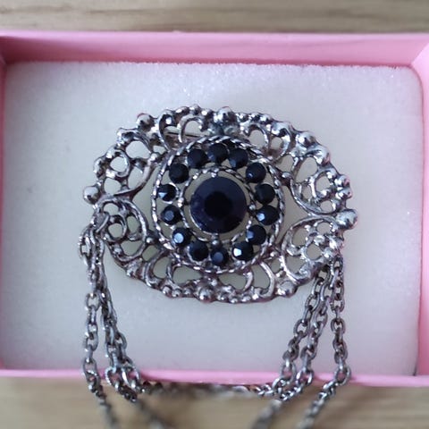 Stor keltisk inspireret broche eller smykke til at fæstne f.eks et tørklæde. Hvidt metal (ikke stemplet) og tre runde connemara marmor stykker (grøn irsk marmor).Der er nogen tegn bagpå som sikkert henviser til fremstiller. Diameter 5,5cm og i fin stand.