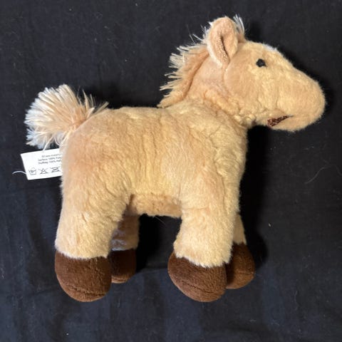 Hesten er brun med mørkebrun man, hale og hove og har et vinrødt dækken på med hvid blondekant.
