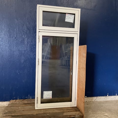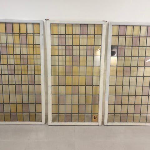 Angiveligt fra vognport på den gamle Aalborg Brandstation. Sammensat af to rammer. måler total 146x275 (og alts hver især 146x137,5cm) karmbredde 3,5cm. Afsyret. glas i 8 ud af i alt 30 felter.