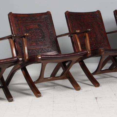 Angel Pazmino højrygget lænestol af udskåret kernelæder og eksotisk træ.