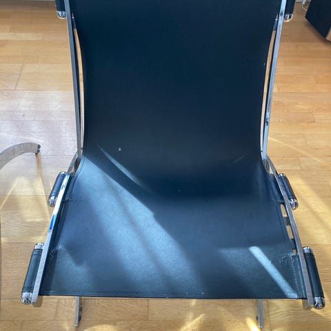 Angel Pazmino højrygget lænestol med stel af eksotisk træ. Sæde og ryg med udskåret patineret kernelæder. Med foldefunktion H. 102/40 B. 67 D. 85 cn.