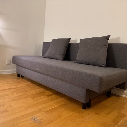 IKEA sovesofa i grå farve. Denne sovesofa er designet til at være både komfortabel og praktisk, hvilket gør den ideel til brug i stuer eller gæsteværelser. Den kan nemt omdannes fra sofa til seng, hvilket gør den alsidig og pladsbesparende. Betrækket er aftageligt og kan vaskes, hvilket gør vedligeholdelsen enkel.