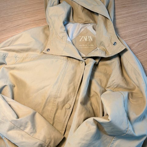 Frakke, Efterårs-/Forårsfrakke, Zara Kids, str. 152, Dejlig vatteret Parka Coat til efterår- forår.Den har falsk pels på overkroppen, lynlås og knapper, to skrålommer, en “snydelomme” foran og aftagelig falsk pelskant på hætten.