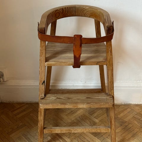 Smuk Ikonisk børnehøjstol i træ og læder.Der mangler en tværpind til fodstøtte til de helt små, huller er forboret som vist på billede.