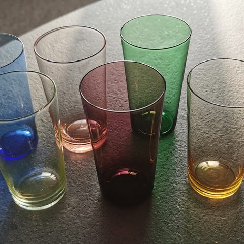 10 gamle sodavandsglas klare med slibninger - højde 10 cm diameter 5,5 cm - pr. stk. kr 20,- samlet kr 125,- et glas har et mikro skår - se sidste foto)