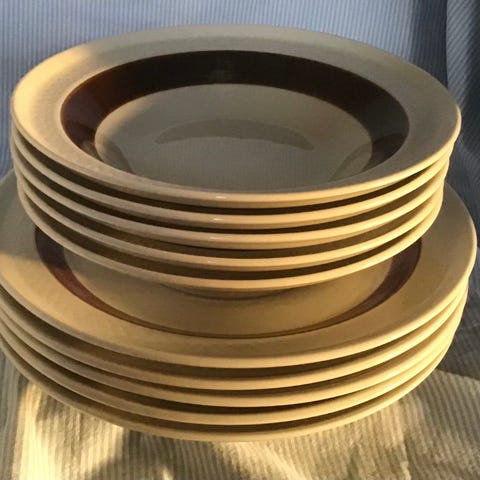 Dybe tallerkner, Rörstrand FORMA, designet i 60-erne af Olle Alberius. Diameter 20 cm. Hvide med flot håndmalet brun stribe og reliefmønster. Kan bruges både til morgenmad, suppe og pasta.