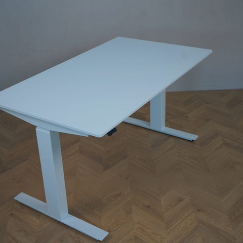 Kvalitets hæve sænkebord med 2 kraftige motorer i hvid. Bordplade er helt ny med kabelgennemføring og understel er brugt. Kabelbakke kan tilkøbes. Bordet kan også fås i 120x80 og 160x80.