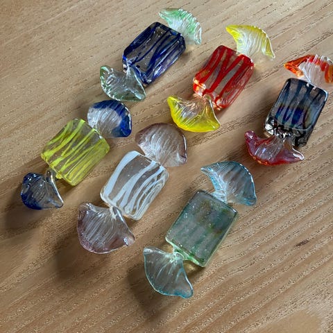 14 røde "kringler" af glas og 32 blå sælges i de to fraktioner. Kender ikke glasmager bag, men alle er håndlavede. Dekorationsglas eller en slags glasrelief / relief. De kan eksempelvis hænge i vinduet eller benyttes til julepynt / juledekoration / borddækning etc.