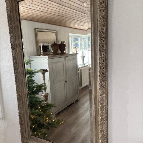 Fransk spejl, Glas & træ, 80 år gl., Stort Fransk spejl, med den rigtige patina, og virkelig smukt spejl. Henv. SMS til 61687009. Kig på Birgers Brocante på Instagram.