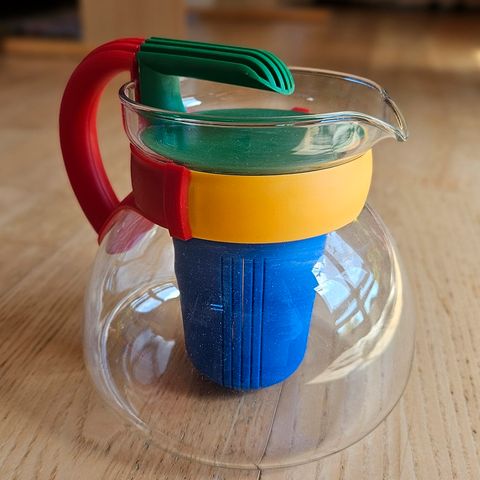 80’er-design i primærfarver (rød / gul / blå plus grøn). Tekande med indbygget tesi fra tyske Geldo Exclusiv. Næsten som ny.