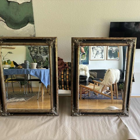Sælger disse to flotte og meget robuste spejle med rammer i klassisk stil. De måler 125 cm i højden og 92 cm i bredden og passer perfekt til stue, entré eller soveværelse.