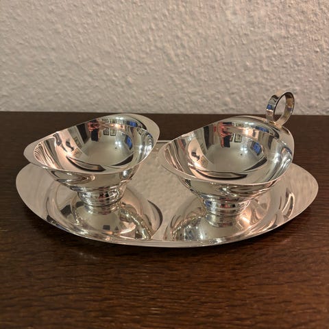 Fin bakke med sukkerskål og flødekande
