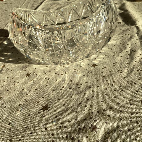 Oval krystalskål dekoreret med facetslebne blomster blade og andre slibninger.
