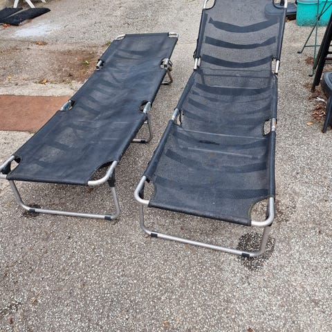 1 stk. hvid solseng m. hylde og 2 stk. blå solsenge. Ok stand.