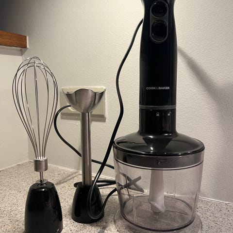 Bamix ledningsfri stavblender i rød, købt i August 2023. Fremstår som ny, er brugt meget lidt. Der er også kværn og diverse knive med.