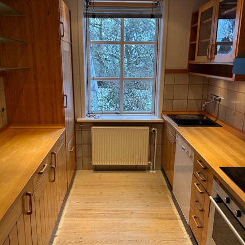 Gamle malede køkkenlåger og køkkenskuffer, som skal renoveres. Kun låger og skuffer ingen korpus. Oprindeligt snedkerlavet køkken.