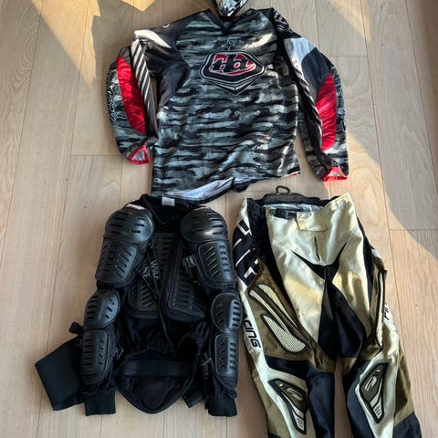 Cross tøj sælges ca 150 pr sæt 1 sæt str. 36 og et sæt str L Ryg skjold, pr stk 50,- kr Hjelm str S fra 250,- kr. En top sikker nakkekrave fra KTM pris 450,- kr ny pris ca 2300,- kr er som ny. Lille EVS nakkekrave pris 150,- kr nypris ca 450,- kr også som ny.