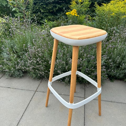 En metalstang fungerer som fodstøtte. Og hvis du sidder sidelæns, bliver den lave ryg til et behageligt armlæn.