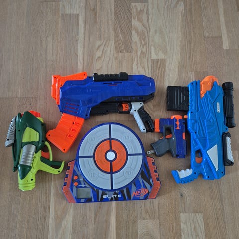 Sælger sejt Nerf-gevær inkl. oppustelig skydeskive og masser af skumpatroner. Perfekt sæt til sjov og sikker skydetræning – både inde og ude. Skydeskiven gør legen ekstra underholdende, og geværet skyder præcist med god kraft.