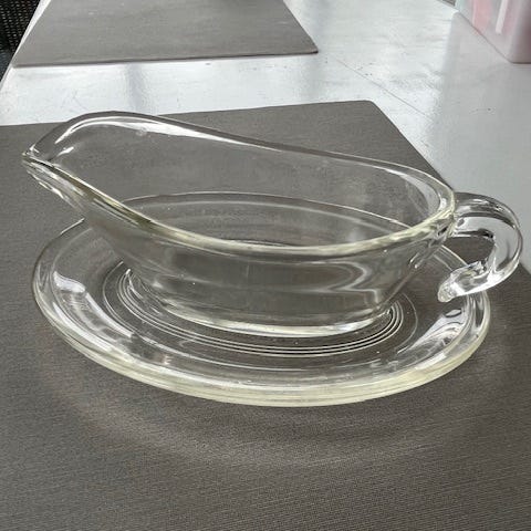 Glas, Ildfast sovsekande med glasunderdel, Phoenix. Made in England, Længde 16,5 cm og bredde 10 cm af underskålen