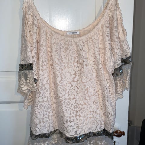 Blend She sort og mønstret lækker tunika med ærme og halskant af pallietter. Str S. Elastisk stof polyester og elastan