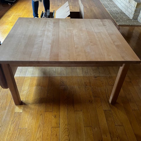 Trænger til en grundig rengøring. Foldet ud, er bordet 142 cm langt. Et tungt bord. Bliver vasket med sæbespåner vand. Leverer ikke, sender ikke.