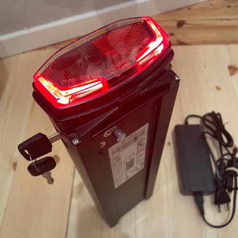 Har dette batteri og lader til elcykel står som ny.