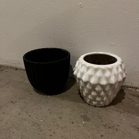 2. Hvid keramik og korkpotte fra Notre Dame. Krukke til planter højde 17cm. Har lidt kalk på kanten ellers pæn stand. 50kr