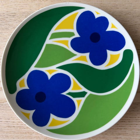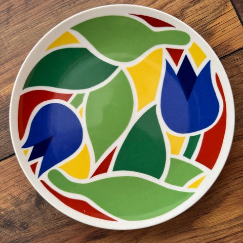 Tallerken med en diameter på 20 cm, designet med et farverigt, blomstret mønster i nuancer af blå, grøn, gul og rød. Bagsiden af tallerkenen har inskriptioner og stempel, hvilket indikerer noget unikt om fremstillingen eller designet.