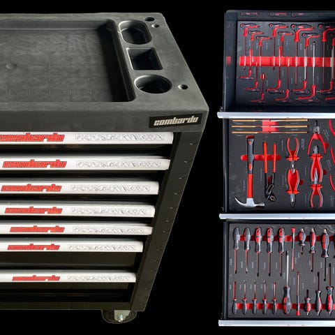 KS Tools masterline værktøjsvogne, specielt til motorsport, den ene med indbygget strøm samt udtag for ledning til bil og holder til bukke, begge med Værktøjstavle som nemt kan afmonteres. Der er en ekstra skuffe med til den smalle vogn, da nederste skuffe er forhøjet.