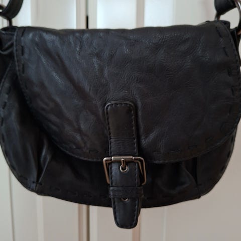 Blød i læderet - fordi den er brugt (patina look) 🙏 Har virkelig været glad for den, fordi den er pæn med mønster, og så er der dejlig mange rum. To med lynlås. Der er ingen fejl i foret. Stropperne kan ikke justeres, men de har en længde, som kan håndholdes eller hvis du foretrækker det - over skulderen.