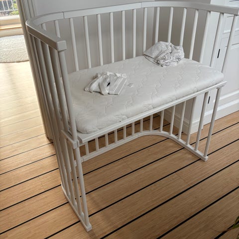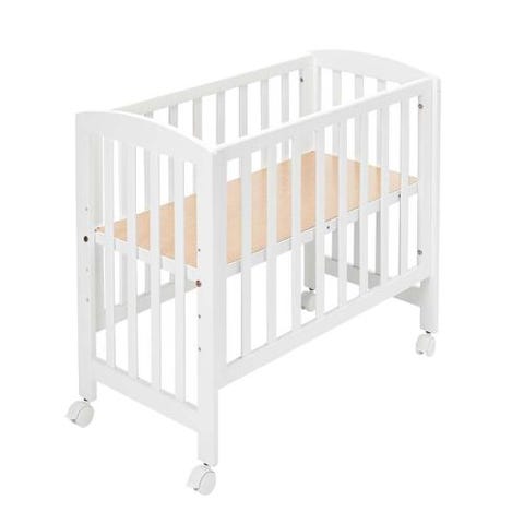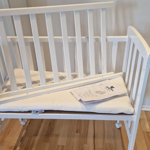 By-my-side crib fra BabyDan, hvid, fremstår generelt pæn, men med hakker øverst på den ene gavl. Sælges med madras og hjemmelavet indsats til vinklet sove-hældning. Madrassens cover trænger til en vask. Sengen er skilt ad, derfor billede fra webshop for at vise hvordan den ser ud samlet.