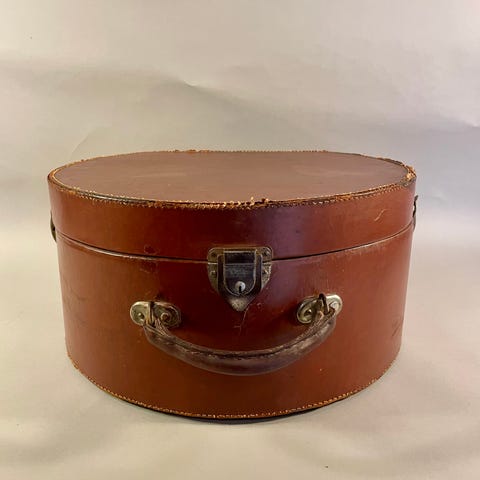 Rund og dekorativ kuffert med bærehåndtag – ideel som opbevaring.