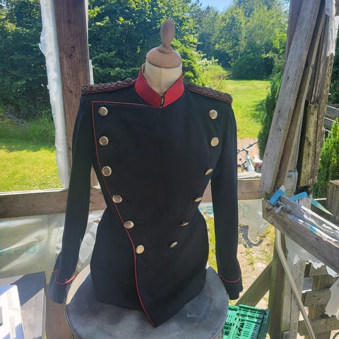Skræddersyet messeuniformsjakke, syet til selvbeklædende flådeofficer i fornem uldkvalitet hos Karl Hoffmann & Søn, Grønnegade, Hj. af Gammelmønt, København K, i 1961.