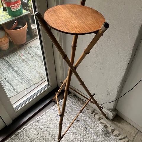 Fin lille blomster opsats i bambus med hylde i hård plast. Pæn stand. Små ridser i plasten, men ses meget lidt. Højde 46 cm. Hylde 18 x 18 cm