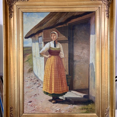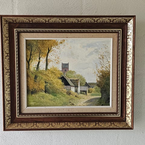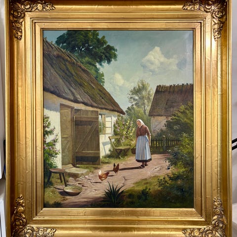 Landskab, gårdparti med personer, mål incl. ramme. 55 x 65 cm.