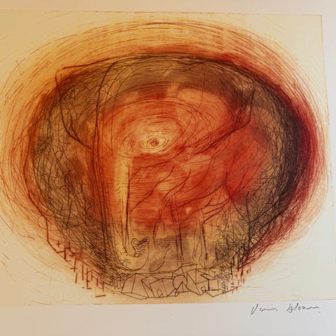 Motivet forestiller fem stiliserede blomsterhoveder i bløde akvarelfarver, trykt på kraftigt papir og signeret af kunstneren.