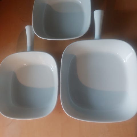Hvid emalje ovenpå, mens rød på siden. Håndtag i sort plastik. Mærket under bund med "R" (støbt).