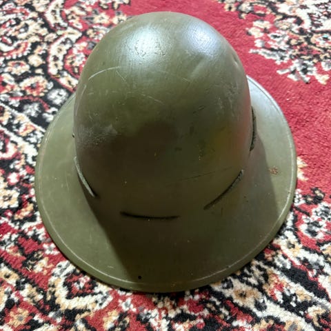 Britisk model 1944 Mk IV hjelm, også kaldet "Turtle hjelm". Bærer præg af at være konserveret til depot.
