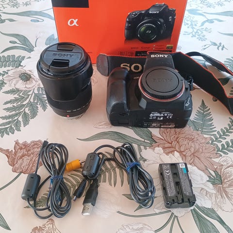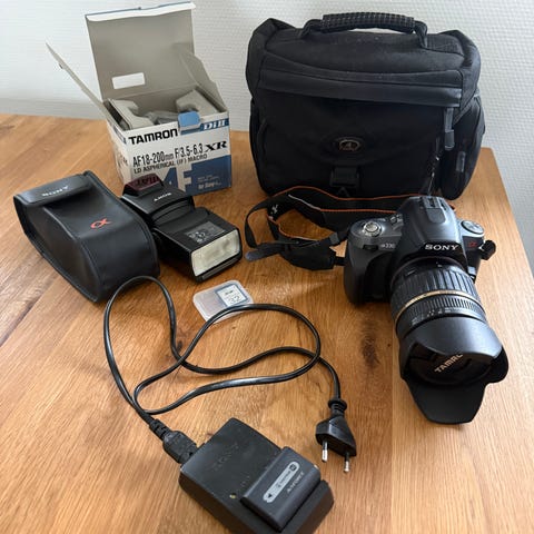 Kamera er 14,2 Mpix og den ekstra optik er 55-200mm. Blitzen er én af SONYs bedre, HVL-F42AM. Der medfølger 2 stk 4GB Compactflash kort og 2 batterier med apparatet. Alt fungerer, som det skal