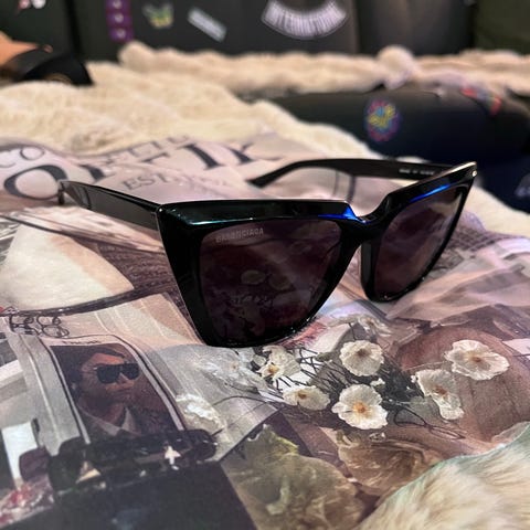 Solbrille fra Balenciaga med glas der har flydende overgang fra næsten ingen beskyttelse forneden til meget beskyttelse foroven, se billede 2. Med støvklud, støvpose og æske.