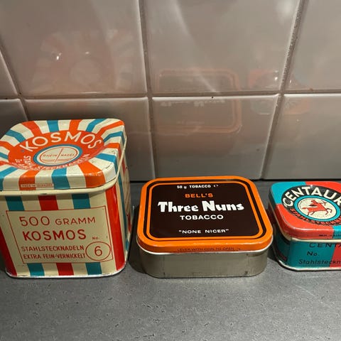 Gamle kaffedåser, tobaksvarer m.m. Retro, sjove og dekorative.